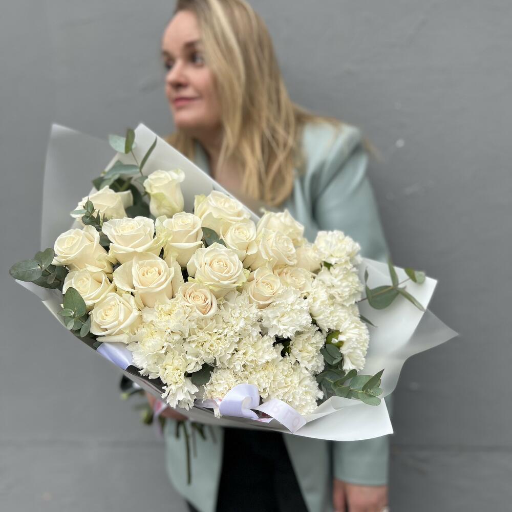 розы – 15 шт.гвоздики – 17 шт.Эвкалипт – 1 шт.Кризал – 1 шт.Аквапак – 1 шт.транспортировочный бокс – 1 шт.