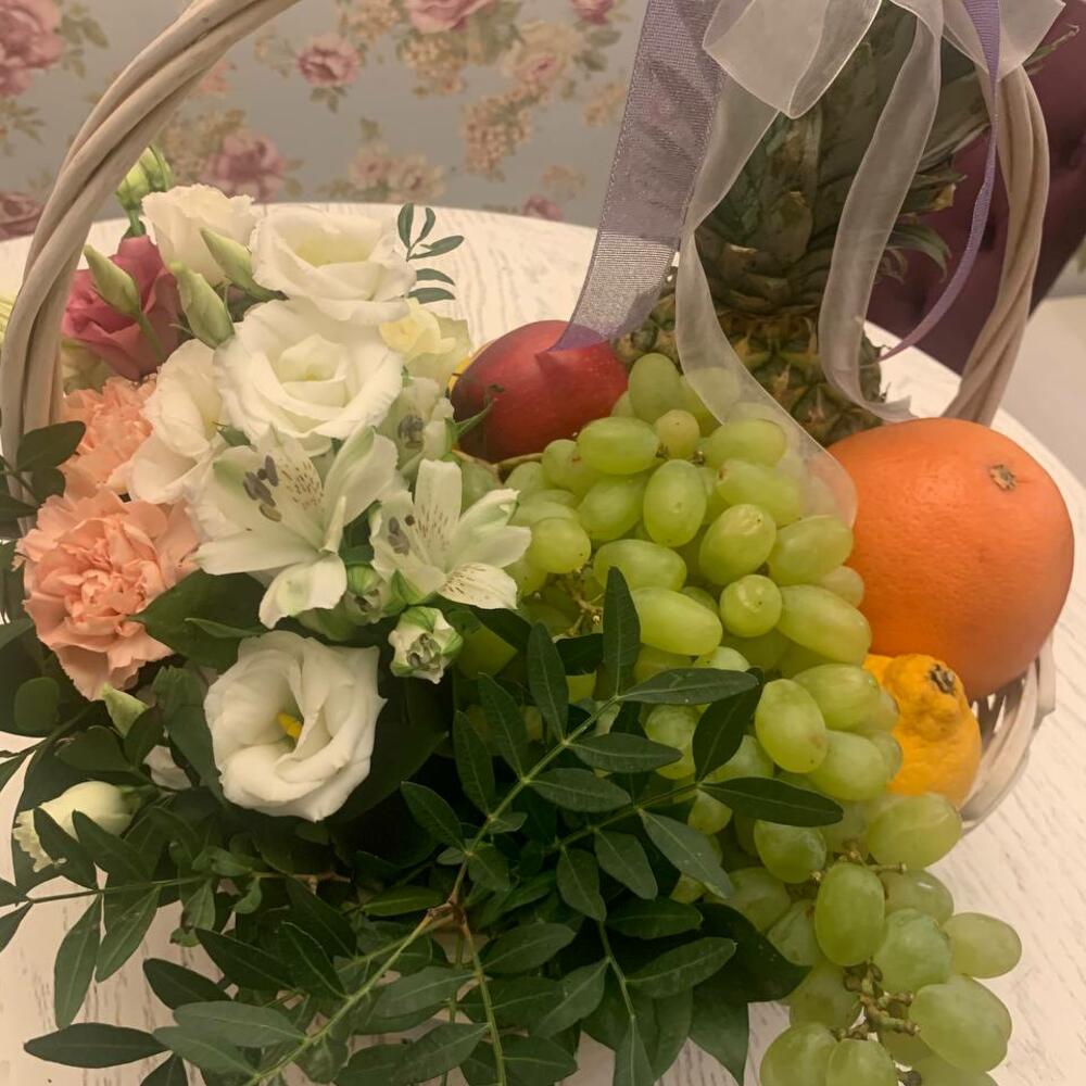 Фрезия – 3 гр.Зелень – 1 шт.Гвоздика – 3 шт.Виноград – 200 гр.Корзина плетеная – 1 шт.Упаковка дизайнерская – 1 шт.Грейпфрут – 1 шт.эустома белая – 1 шт.ананас декоративный – 1 шт.лимоны – 200 гр.мандарины – 500 гр.яблоки красные – 500 гр.