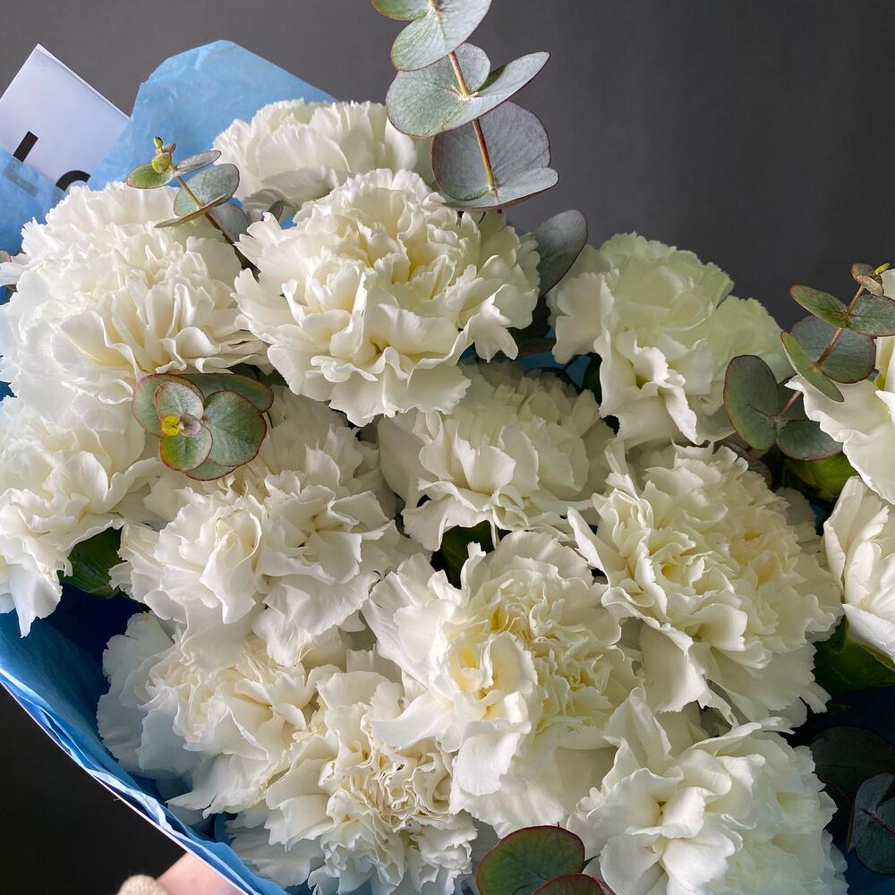 Диантус сортовой – 15 шт.Эвкалипт – 1 шт.Тишью – 2 шт.Упаковка дизайнерская – 1 шт.