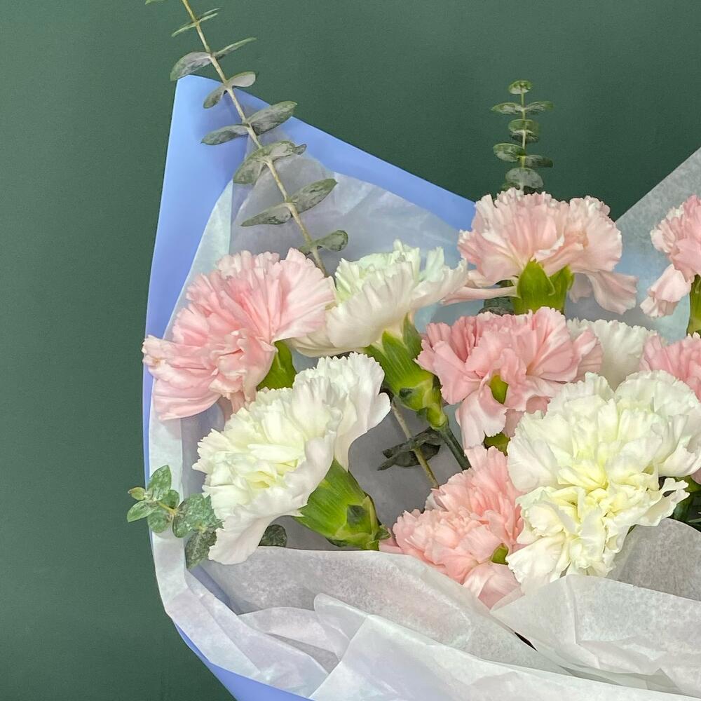 Диантус сортовой – 13 шт.Зелень – 2 шт.Упаковка дизайнерская – 1 шт.Открытка мини – 1 шт.уходовое средство для цветов – 1 шт.Аквабокс – 1 шт.транспортировочная упаковка – 1 шт.