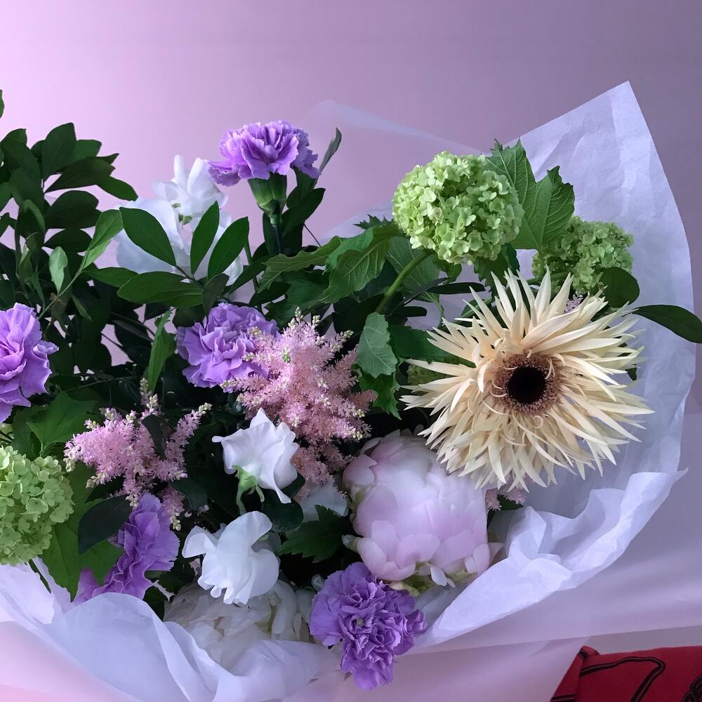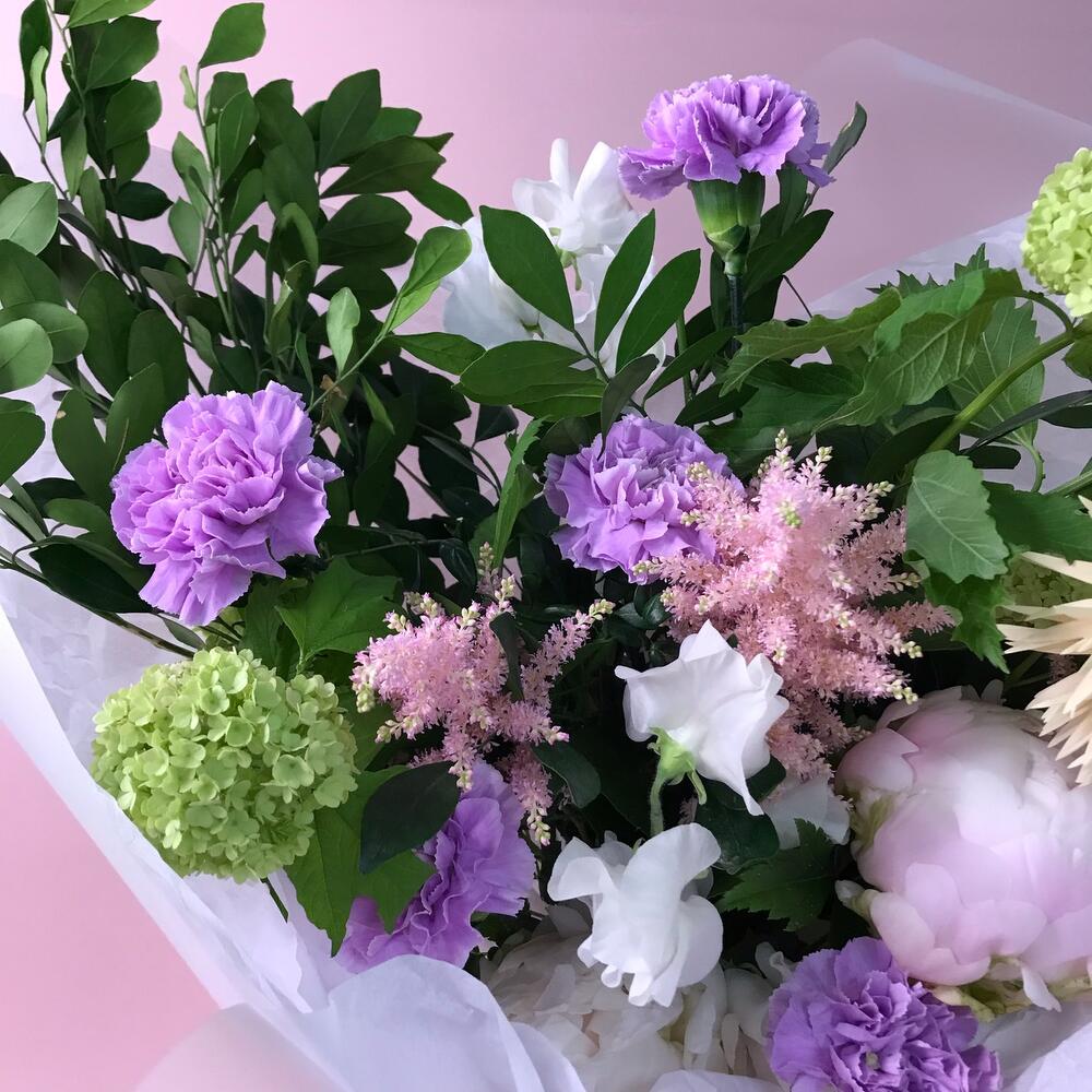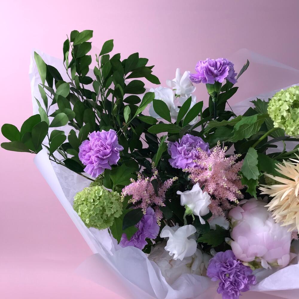 Оформление – 1 шт.Тишью – 3 шт.Пион Италия – 2 шт.Латирус – 2 шт.Диантус мун аква – 5 шт.Рускус Италия – 5 шт.Вибурнум – 2 шт.гербера томагавк – 1 шт.Астильба Европа – 3 шт.
