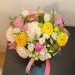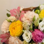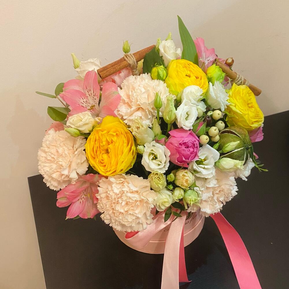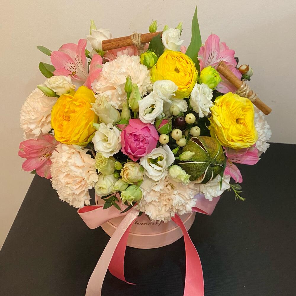Цветы в большой коробке: садовые розы, лизиантус, маттиола, тюльпаны