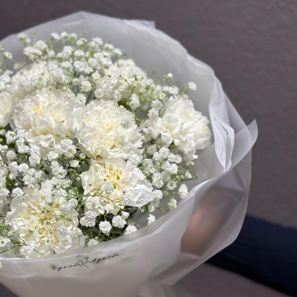 Гипсофила – 2 шт.Лента атласная – 1 шт.Тишью – 2 шт.Пленка матовая – 2 шт.диантусы – 9 шт.