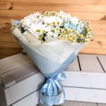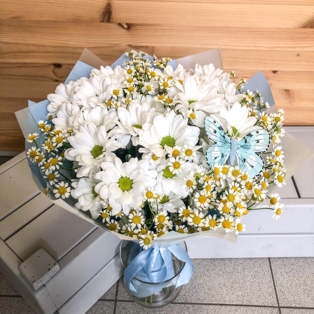 Танацетум – 7 шт.Хризантема Сантини – 4 шт.Упаковка дизайнерская – 1 шт.Лента атласная – 1 шт.