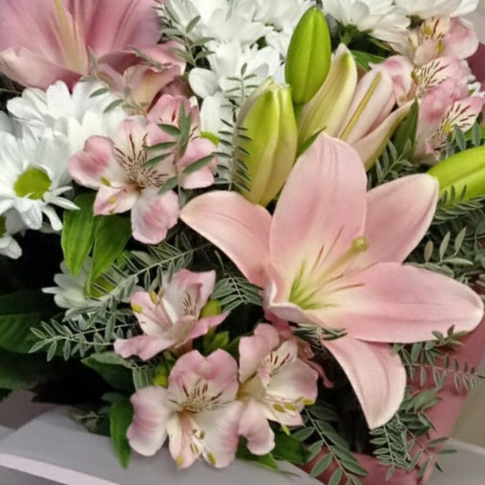 Лилия розовая – 2 шт. Хризантема кустовая ромашковая – 3 шт. Альстромерия Микс Европа – 4 шт.