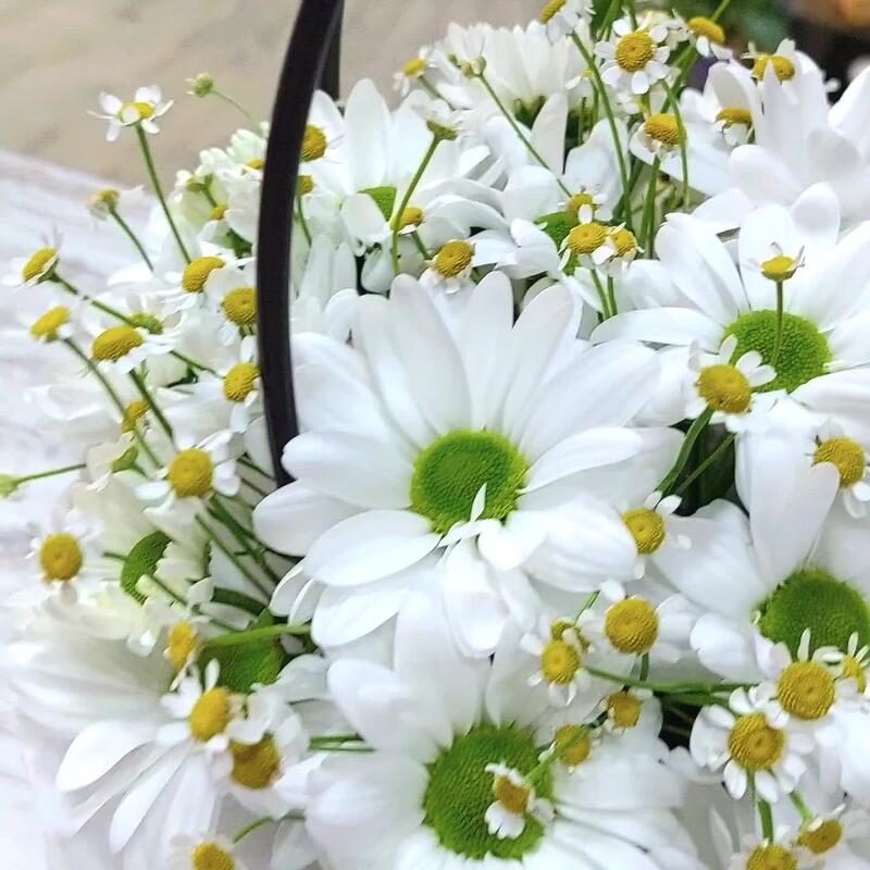 Лента атласная – 2 шт.Тишью – 2 шт.Хризантема Ромашковая – 4 шт.Открыточка с вашими пожеланиями – 1 шт.Оазис флористический – 1 шт.транспортировочная упаковка – 1 шт.танацетум ромашка – 5 шт.