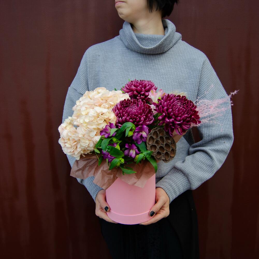 Хризантема – 3 шт. Гортензия – 1 шт. Лотос – 1 шт. Альстромерия – 3 шт. мискантус – 1 шт.