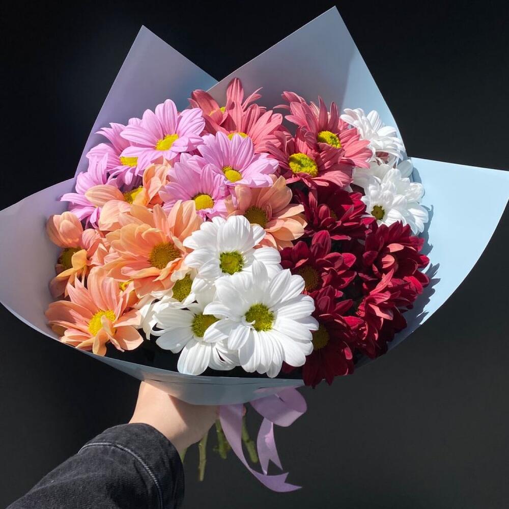 Хризантема кустовая – 7 шт. Упаковка дизайнерская – 2 шт. Открыточка с вашими пожеланиями – 1 шт.