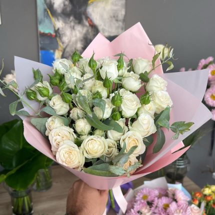Букет из пионовидных роз мэнсфилд парк с эустомой и эвкалиптом