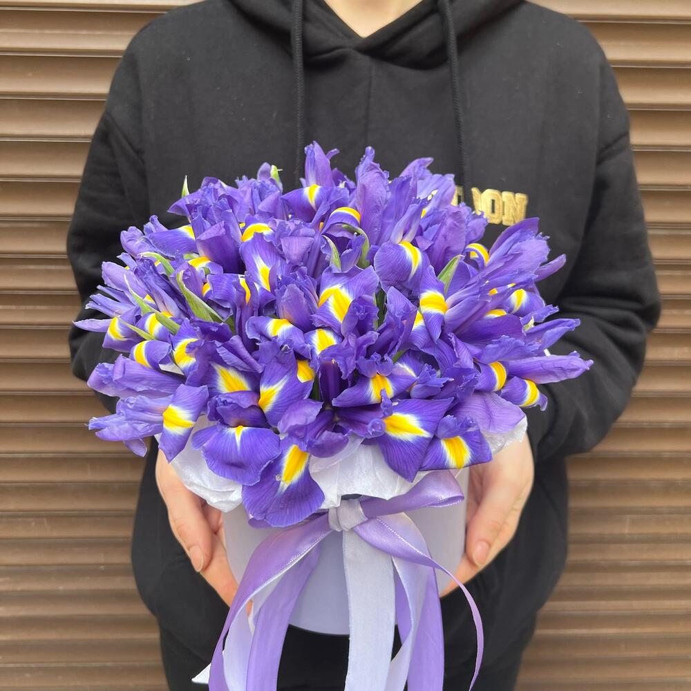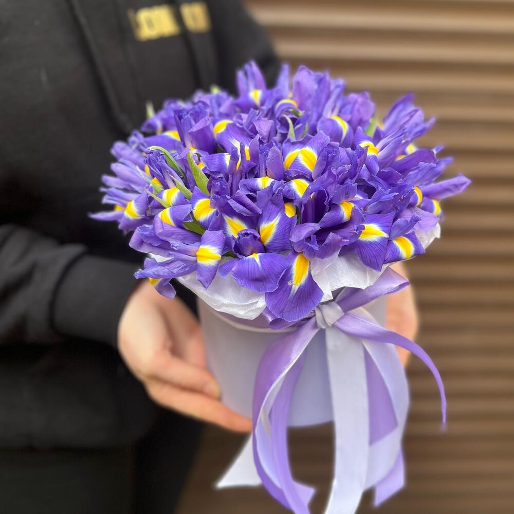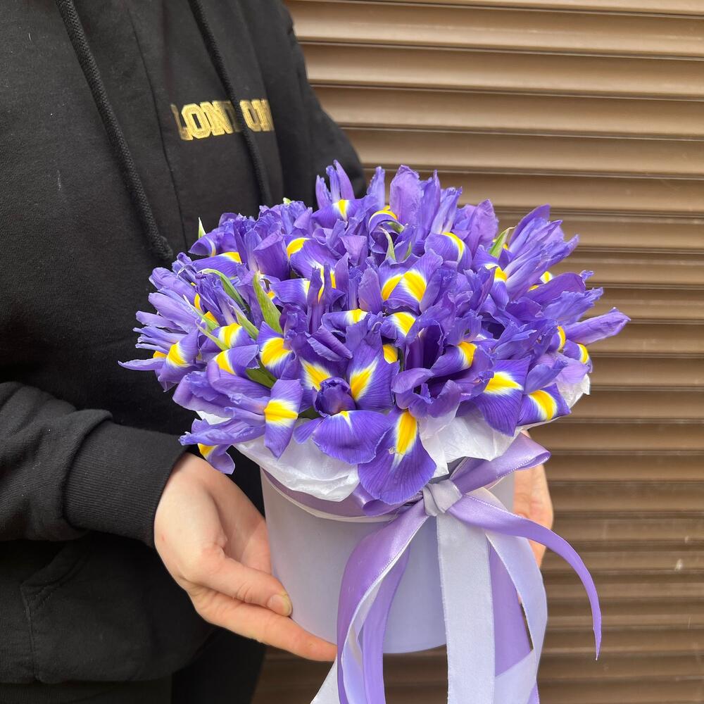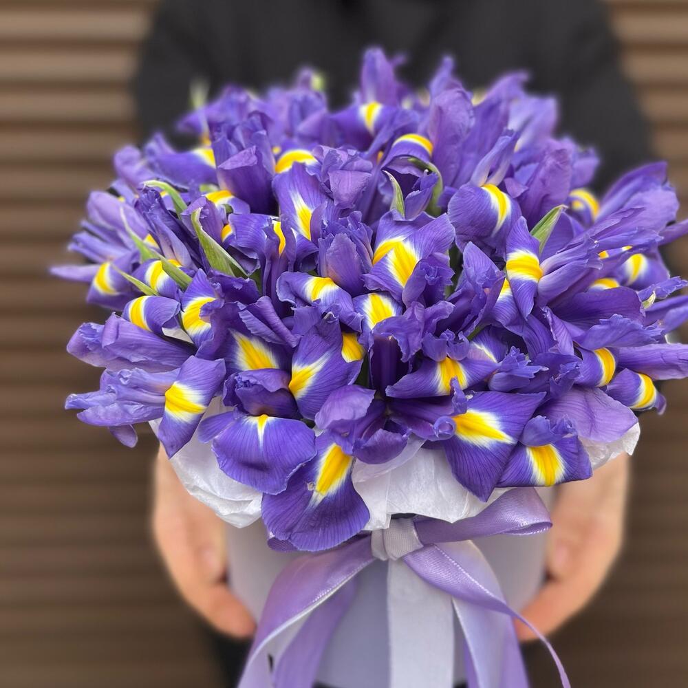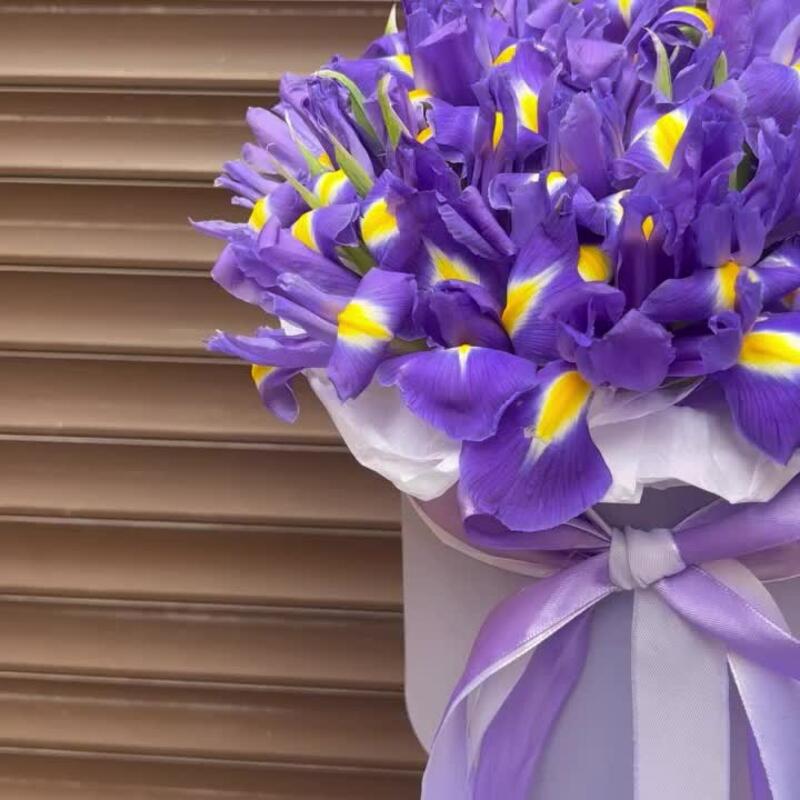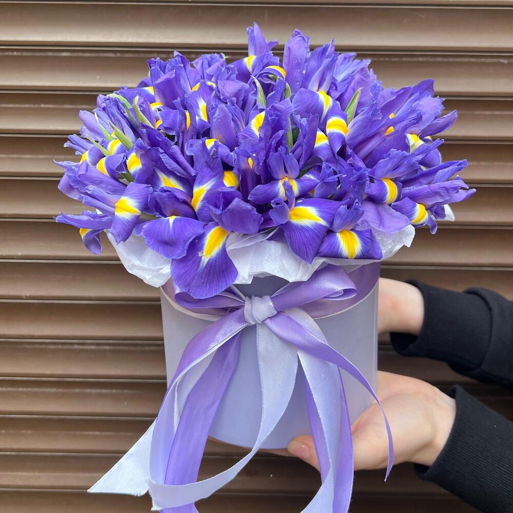 Ирис – 25 шт.Лента атласная – 2 шт.Коробка – 1 шт.Оазис флористический – 1 шт.