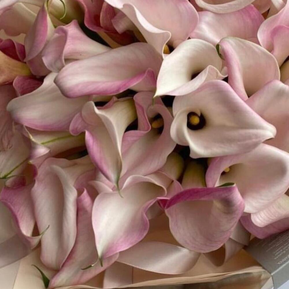 Калла розовая – 51 шт.Упаковка дизайнерская – 2 шт.Лента атласная – 2 шт.Открыточка с вашими пожеланиями – 1 шт.хорошее настроение – 100 шт.инструкция по уходу за цветами – 1 шт.коробка переноска – 1 шт.Кризал – 1 шт.