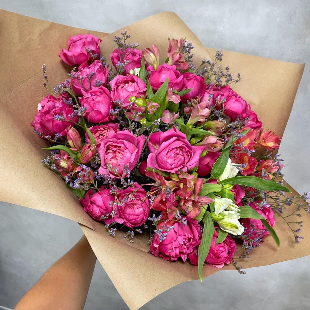 Альстромерия – 8 шт.Лимониум – 2 шт.Роза кустовая пионовидная – 7 шт.