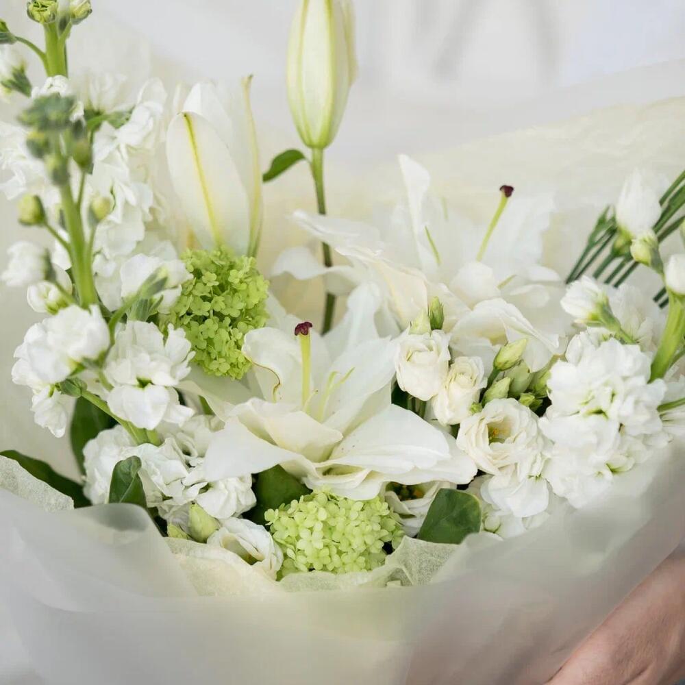 Вибурнум – 3 шт.Лизиантус – 3 шт.Маттиола – 3 шт.Лента атласная – 1 шт.Упаковка дизайнерская – 6 шт.лилия дабл – 1 шт.