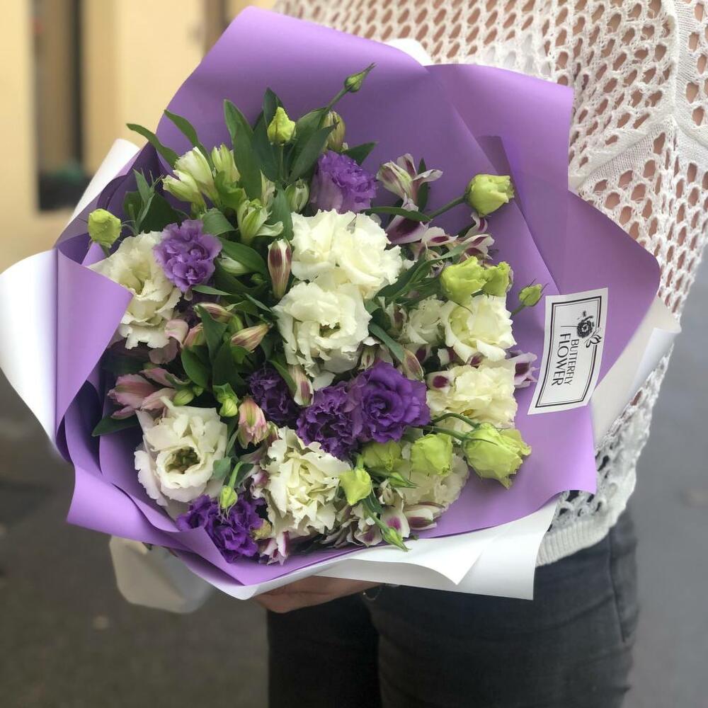 Букет из эустомы и альстромерии в стильной упаковке “Коктобе”