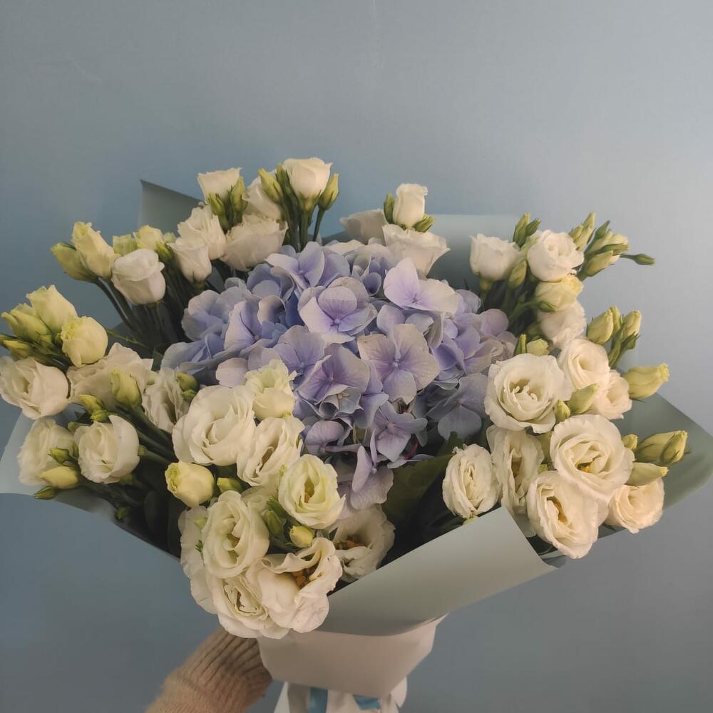 Букет из гортензии, роз, эустомы, вереска, диантусов, кустовых пионовидных роз и седума в стильной упаковке "Ньюкасл"