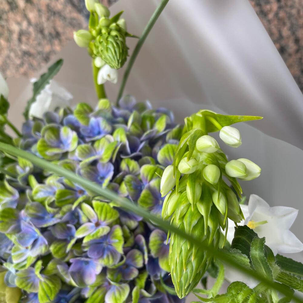 Гортензия – 1 шт.Кампанула – 3 шт.Упаковка – 1 шт.Эустома – 1 шт.Лента атласная – 1 шт.Орнитогалум – 2 шт.зелень сезонная микс – 2 шт.