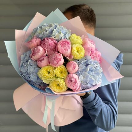 Ніжний букет в рожевих кольорах з гортензією неодмінно подарую усмішку вашій дорогій людині.