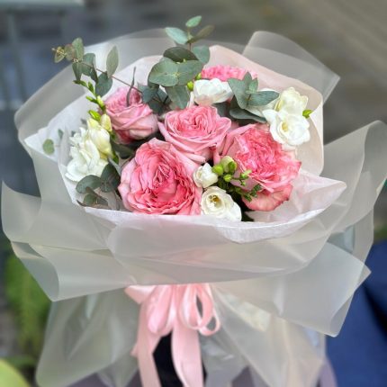 эустома белая – 2 шт. гортензія – 1 шт. евкаліпт – 1 шт. фрезія – 3 шт. троянда рожева – 3 шт. кущова троянда – 1 шт.