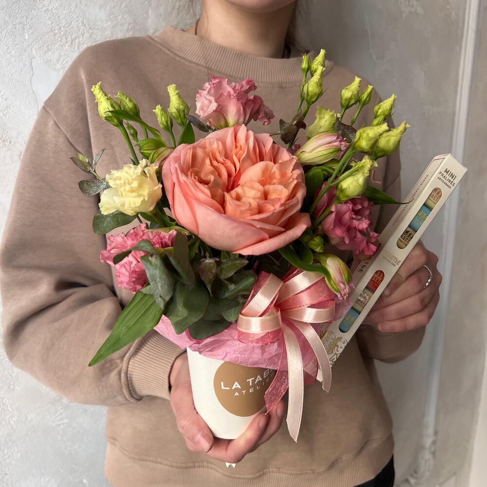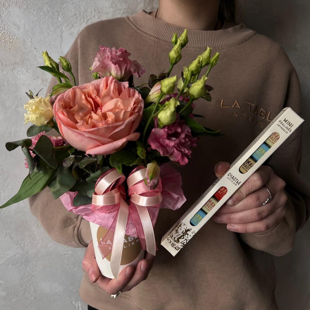 Альстромерия – 1 шт.Лизиантус – 1 шт.Эвкалипт – 1 шт.пинк экспрешн – 1 шт.стакан крафт – 1 шт.набор шоколада «счастье» – 1 шт.