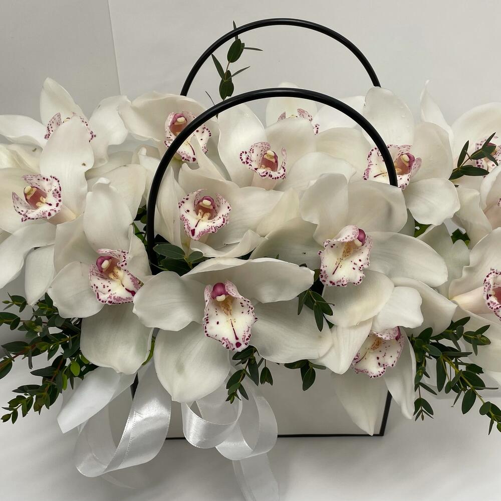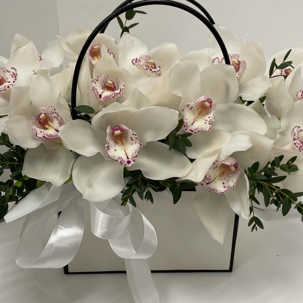 Писташ – 2 шт.Сумочка – 1 шт.Орхидея белая – 15 шт.Оазис флористический – 1 шт.