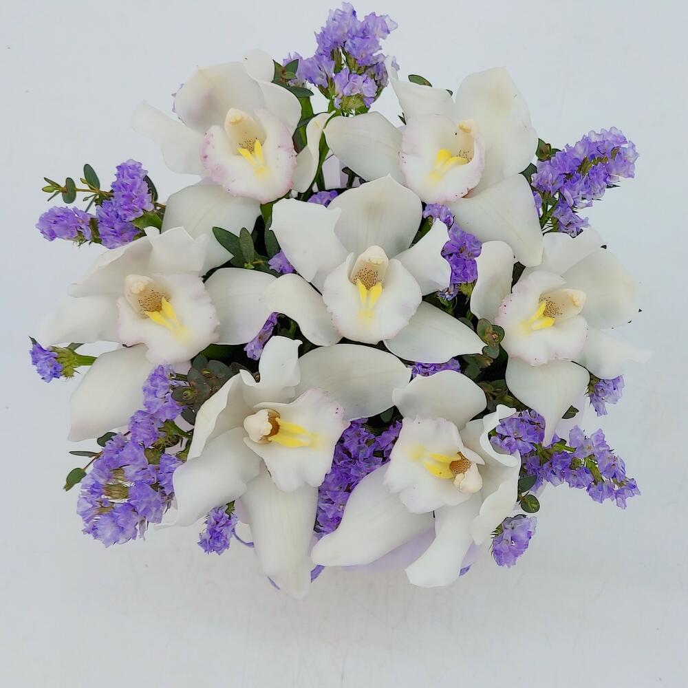 Орхидея цимбидиум бутон – 7 шт.Статица – 3 шт.Зелень – 3 шт.Пленка матовая – 1 шт.Лента Кружево – 1 шт.Флористическая губка (оазис) – 1 шт.
