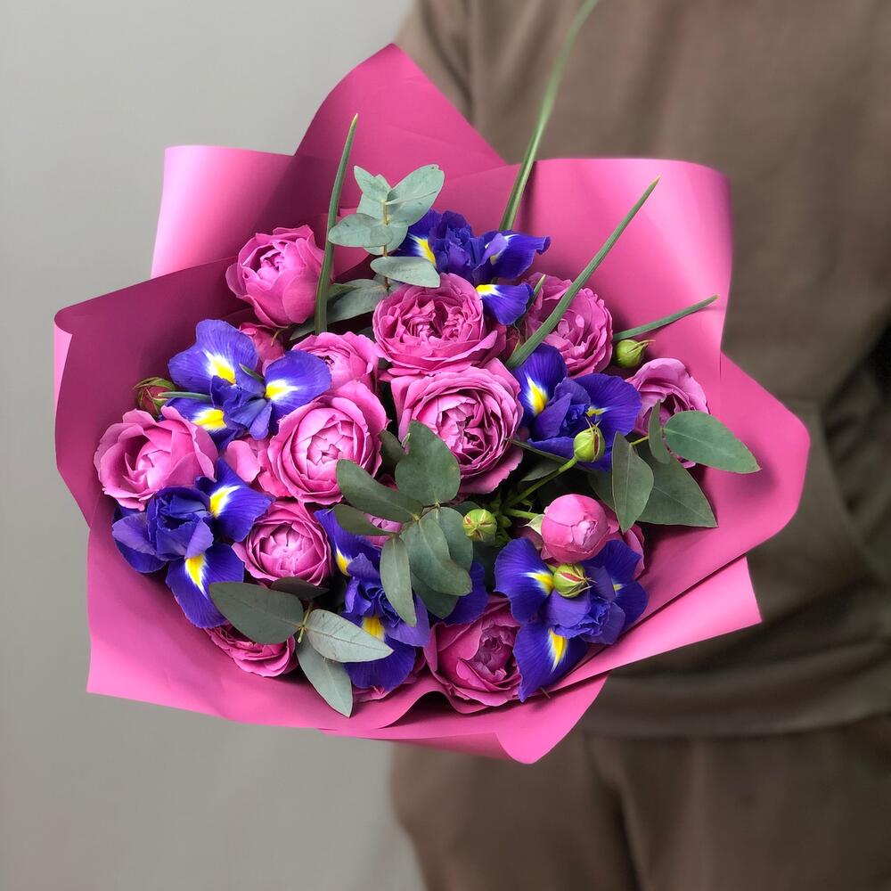 Авторский букет с ирисами и розами "Весенний микс"
