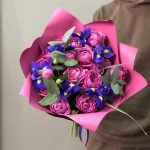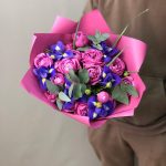 Зелень – 4 шт.Ирис синий – 6 шт.розы пионовидные кустовые – 5 шт.оформление корейская пленка – 1 шт.