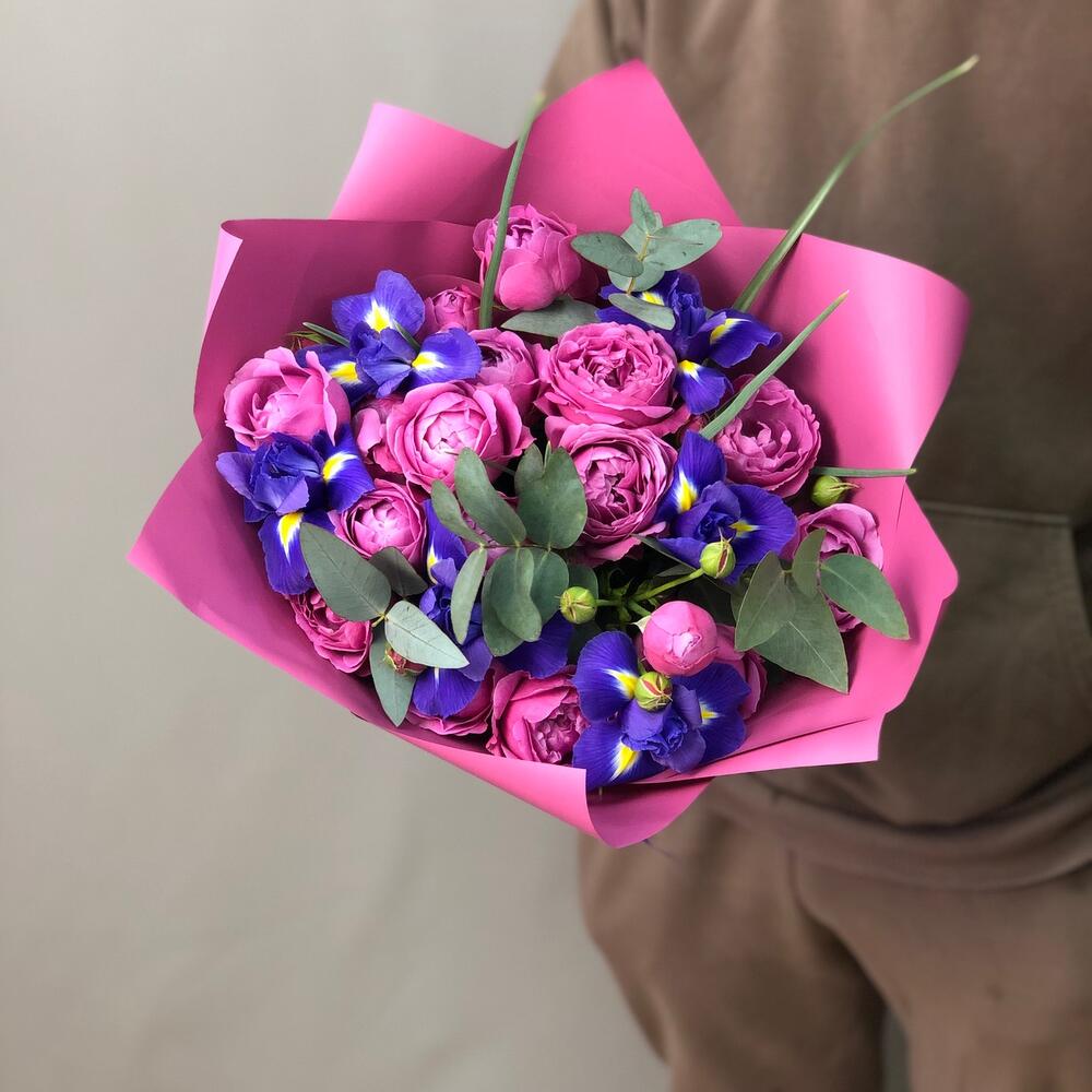 Авторский букет с ирисами и пионовидными розами