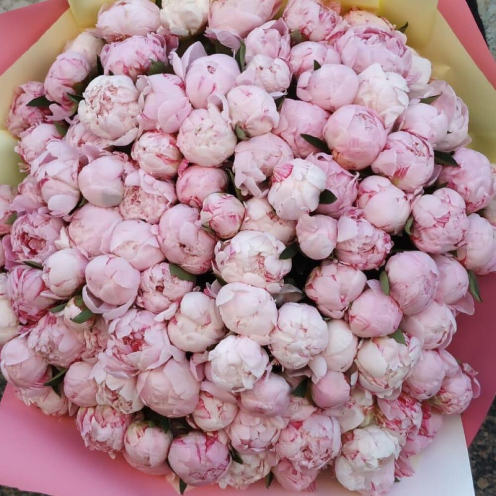 пионы – 101 шт.Упаковка матовая пленка – 1 шт.Атласная лента – 1 шт.