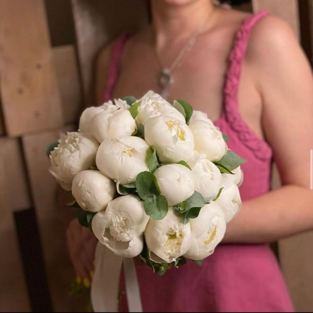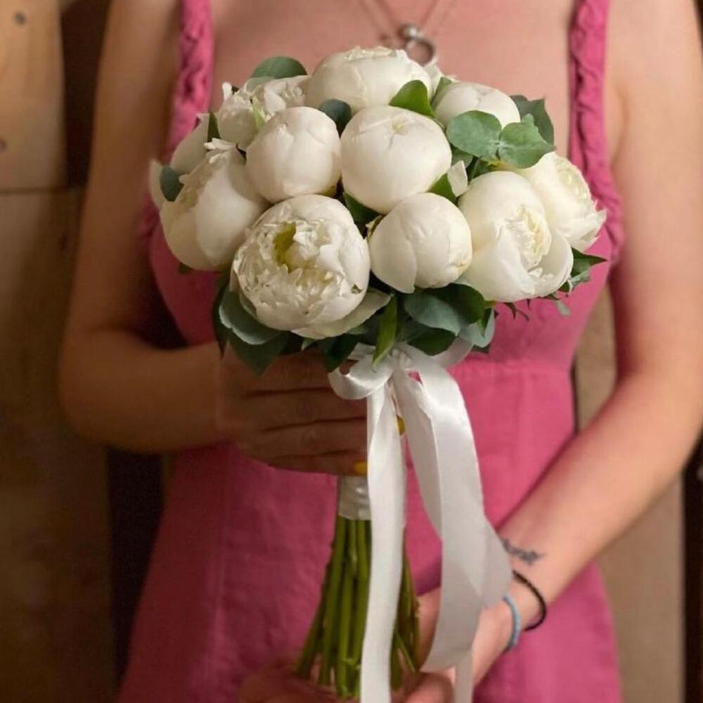 Пион белый – 13 шт.Упаковка дизайнерская – 1 шт.Лента атласная – 2 шт.Открыточка с вашими пожеланиями – 1 шт.хорошее настроение – 100 шт.инструкция по уходу за цветами – 1 шт.коробка переноска – 1 шт.Кризал – 1 шт.Эвкалипт – 10 шт.