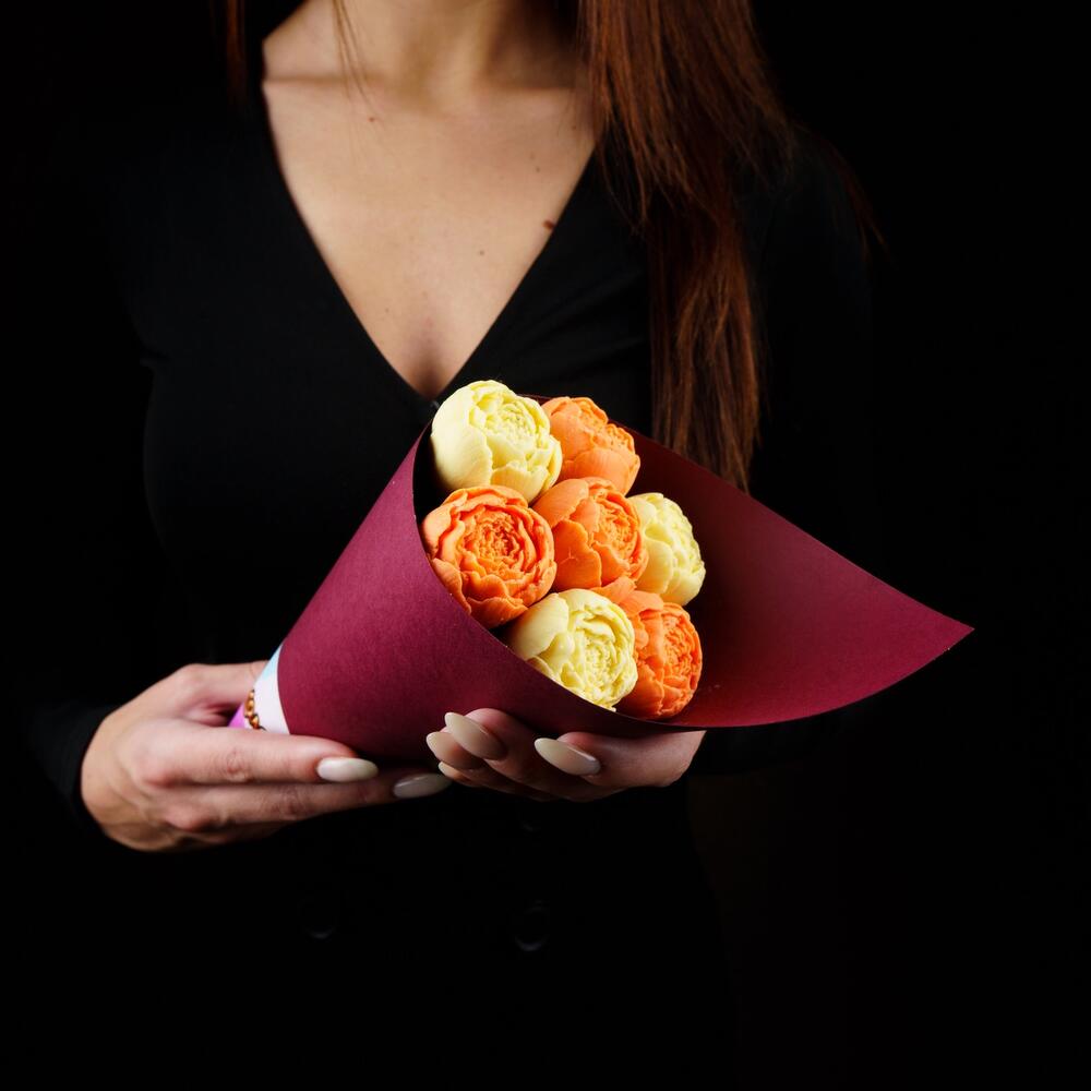 шоколадные пионы из бельгийского шоколада – 7 шт.Упаковка Кулек – 1 шт.Прозрачная пленка – 1 шт.
