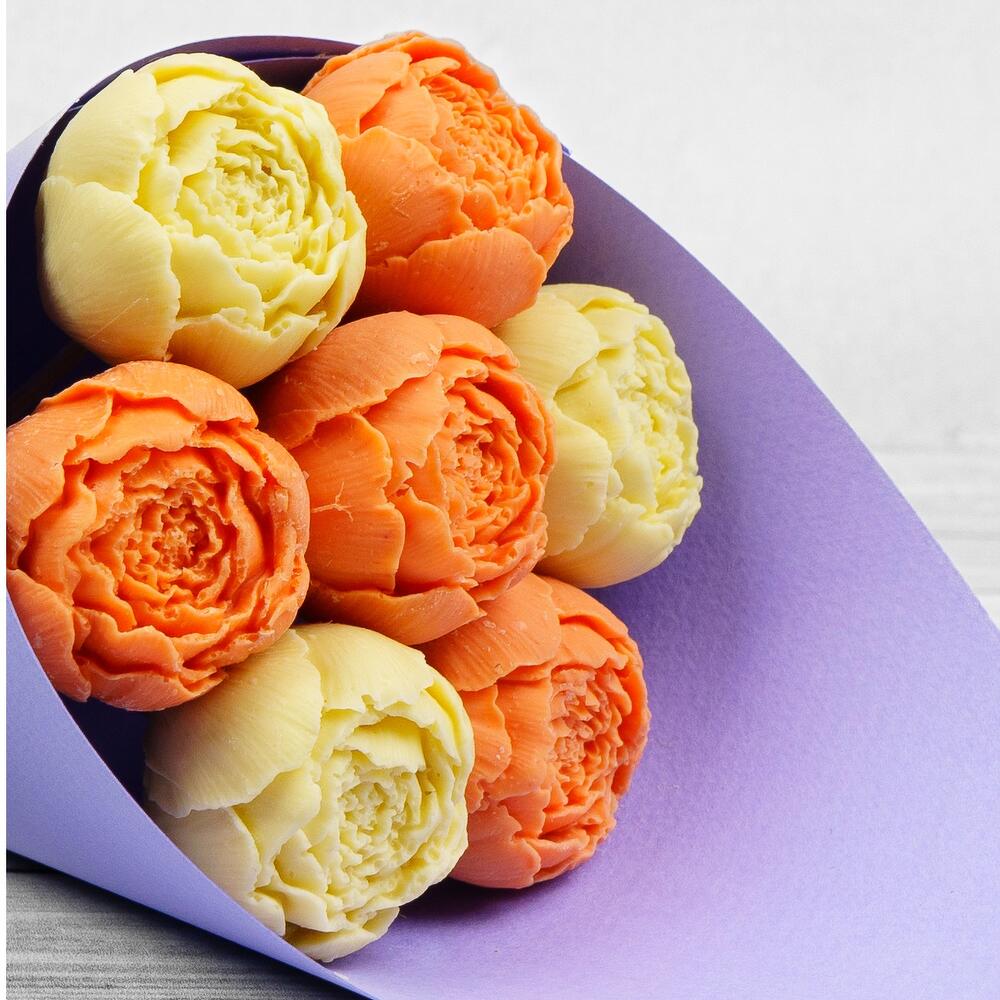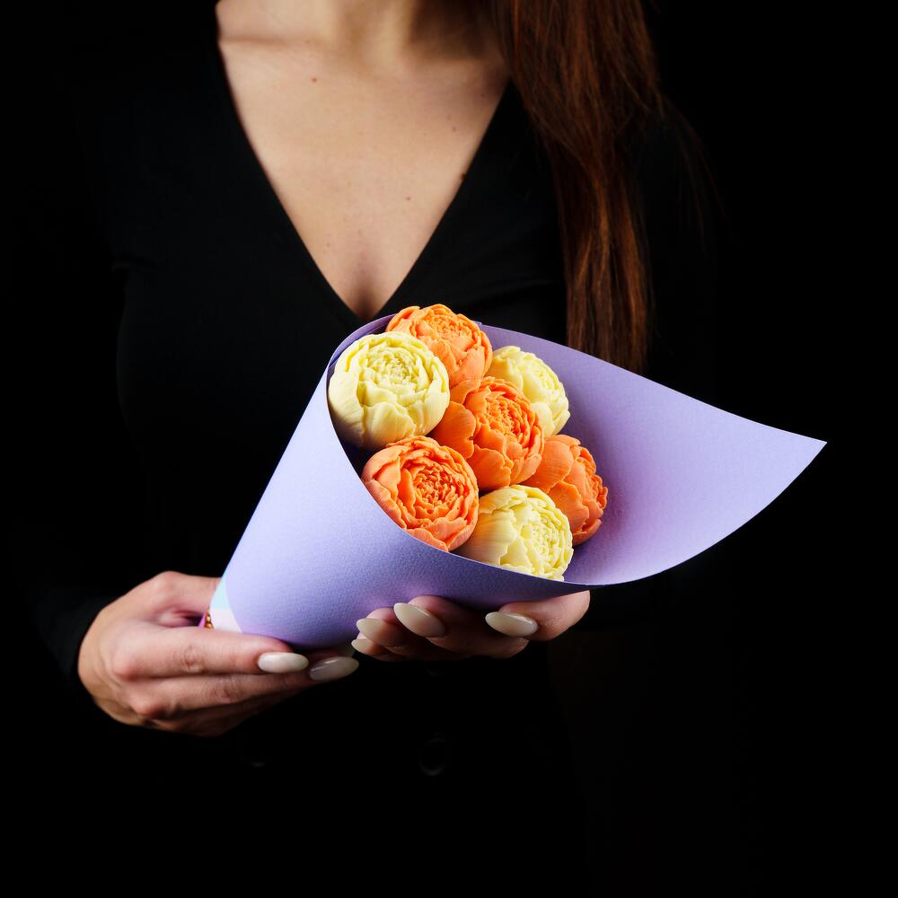 Упаковка Кулек – 1 шт.Прозрачная пленка – 1 шт.шоколадные пионы из бельгийского шоколада – 7 шт.