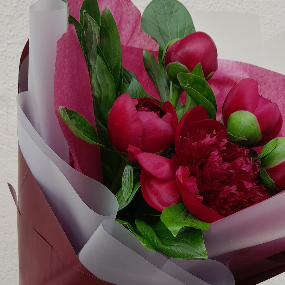 Пион – 5 шт.Лента атласная – 2 шт.Упаковка дизайнерская – 3 шт.