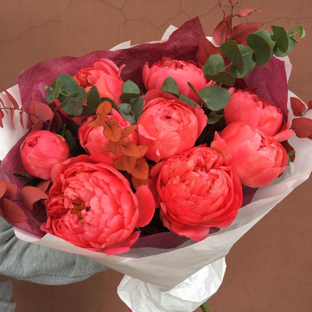 Пион – 9 шт.Эвкалипт – 3 шт.Лента атласная – 1 шт.Тишью – 2 шт.Упаковка крафт – 3 шт.