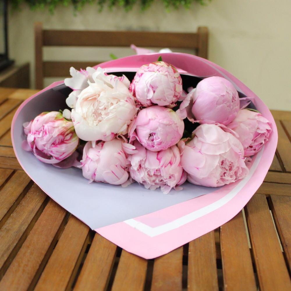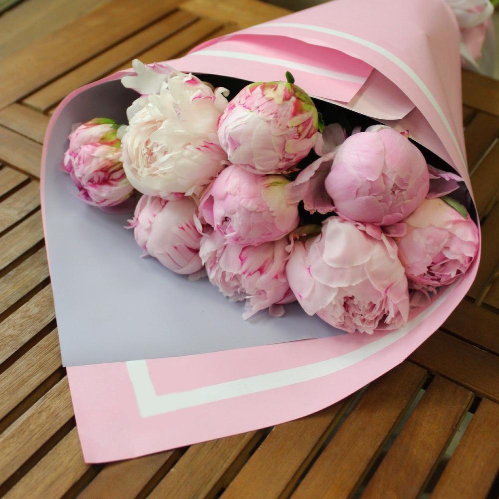 Лента атласная – 2 шт.Пион розовый – 9 шт.Пленка матовая – 2 шт.Крафт дизайнерский – 1 шт.