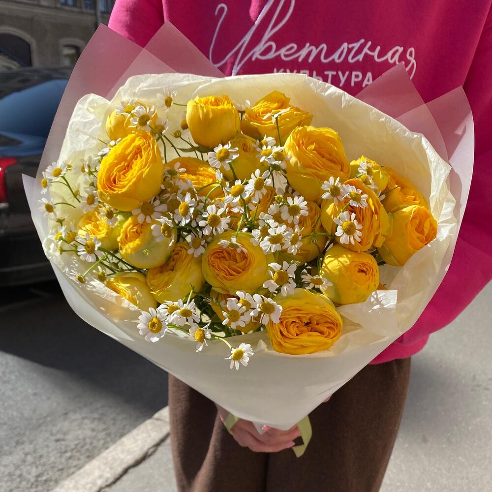 Упаковка дизайнерская – 1 шт.Матрикария (Ромашка Камила) – 3 шт.розы кустовые пионовидные – 5 шт.