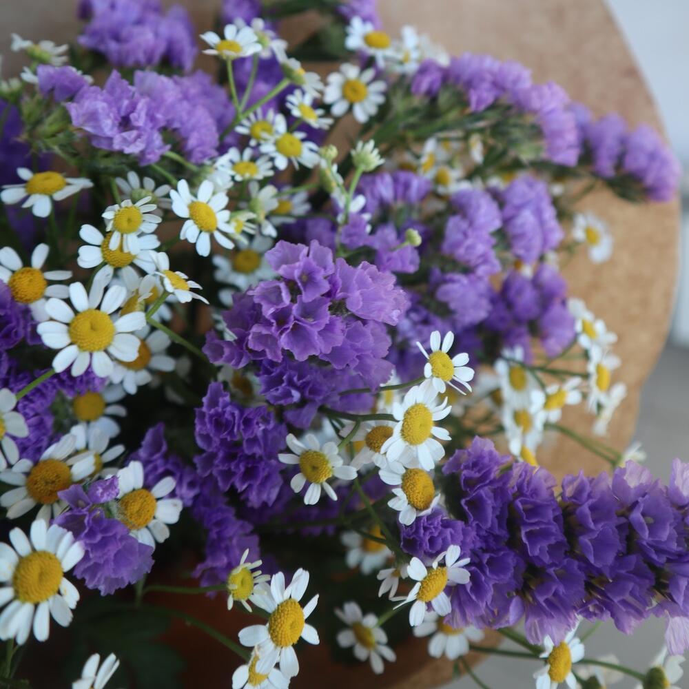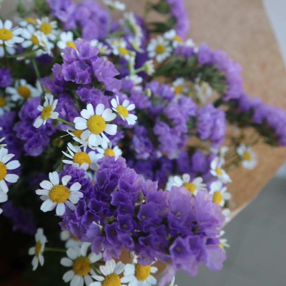 Статица – 2 шт.Матрикария (Ромашка Камила) – 4 шт.Крафт упаковка – 1 шт.бечевка натуральная – 1 шт.