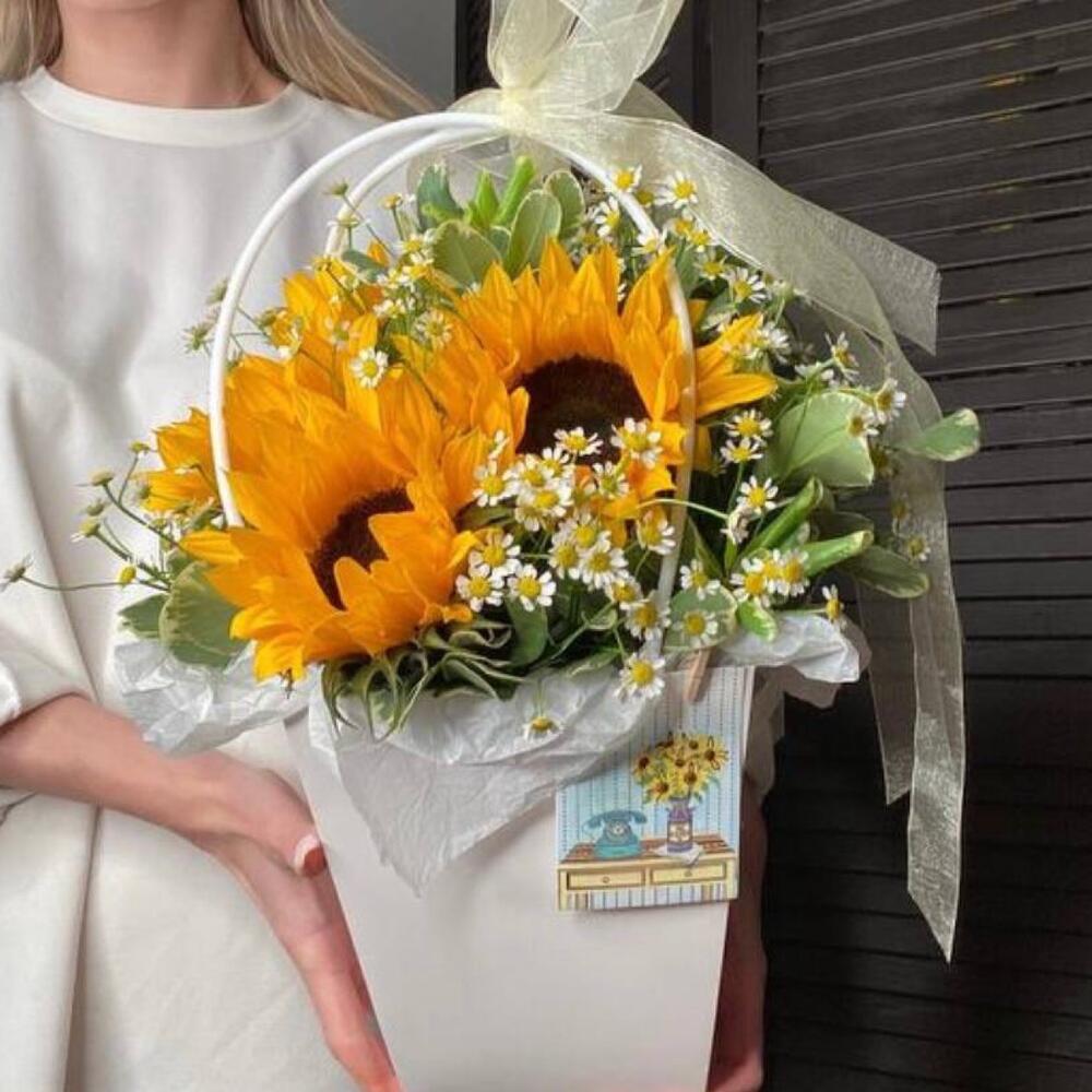 Питтоспорум – 6 шт.Ромашка – 10 шт.Подсолнух – 5 шт.Сумочка – 1 шт.Оазис флористический – 1 шт.Тишью белое – 1 шт.