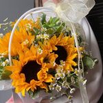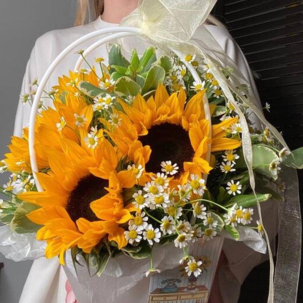 Сезонный букет в солнечных светлых оттенках будет прекрасным подарком, напоминающем о том, что лето всегда рядом. Букеты с подсолнухами – неординарный и яркий подарок с положительными эмоциями в комплекте.