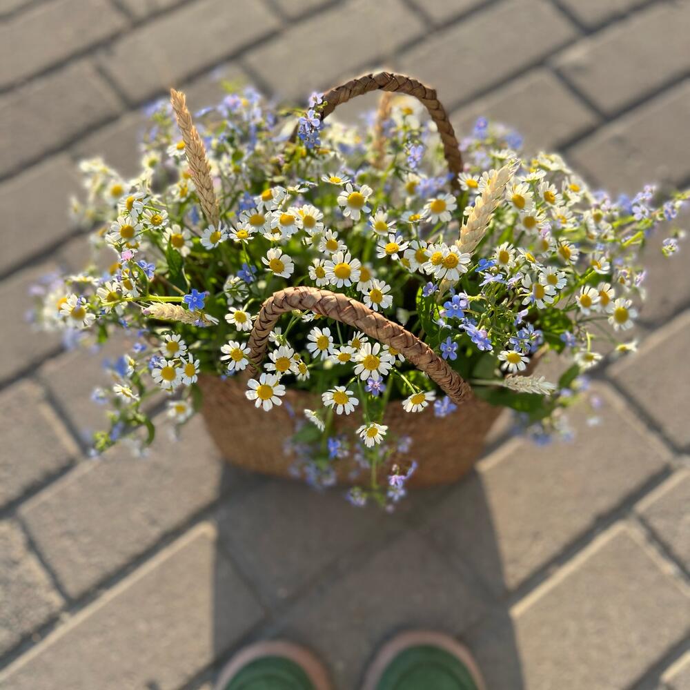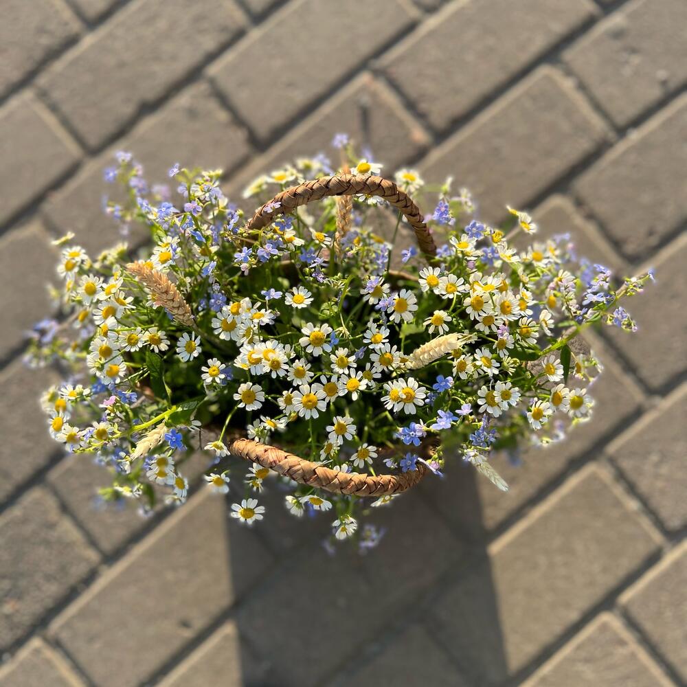 Ромашки и незабудки в плетёной сумке