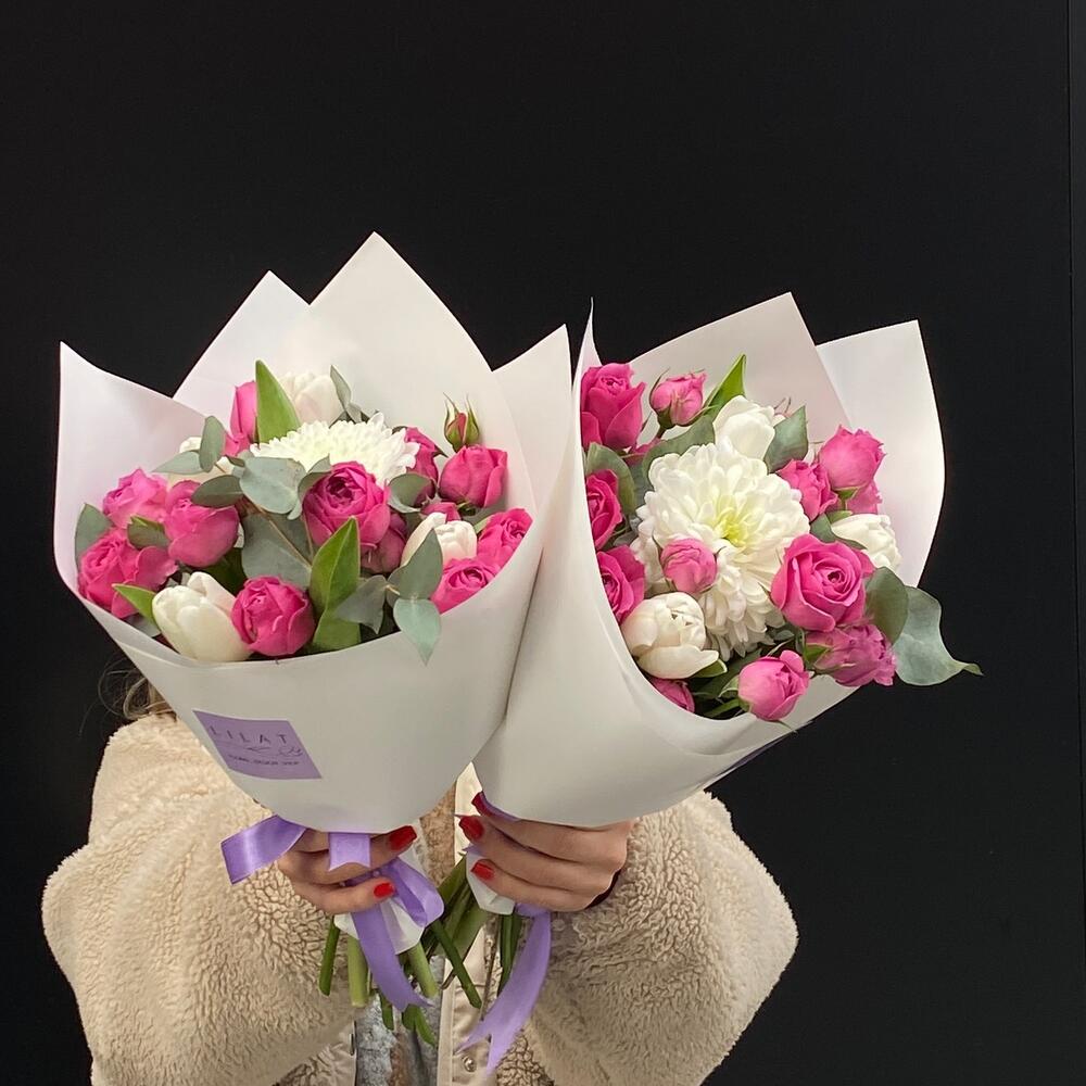 Кустовая роза – 10 шт. Тюльпан – 7 шт. Хризантема кустовая – 2 шт. Эвкалипт – 3 шт. Открыточка с вашими пожеланиями – 1 шт.