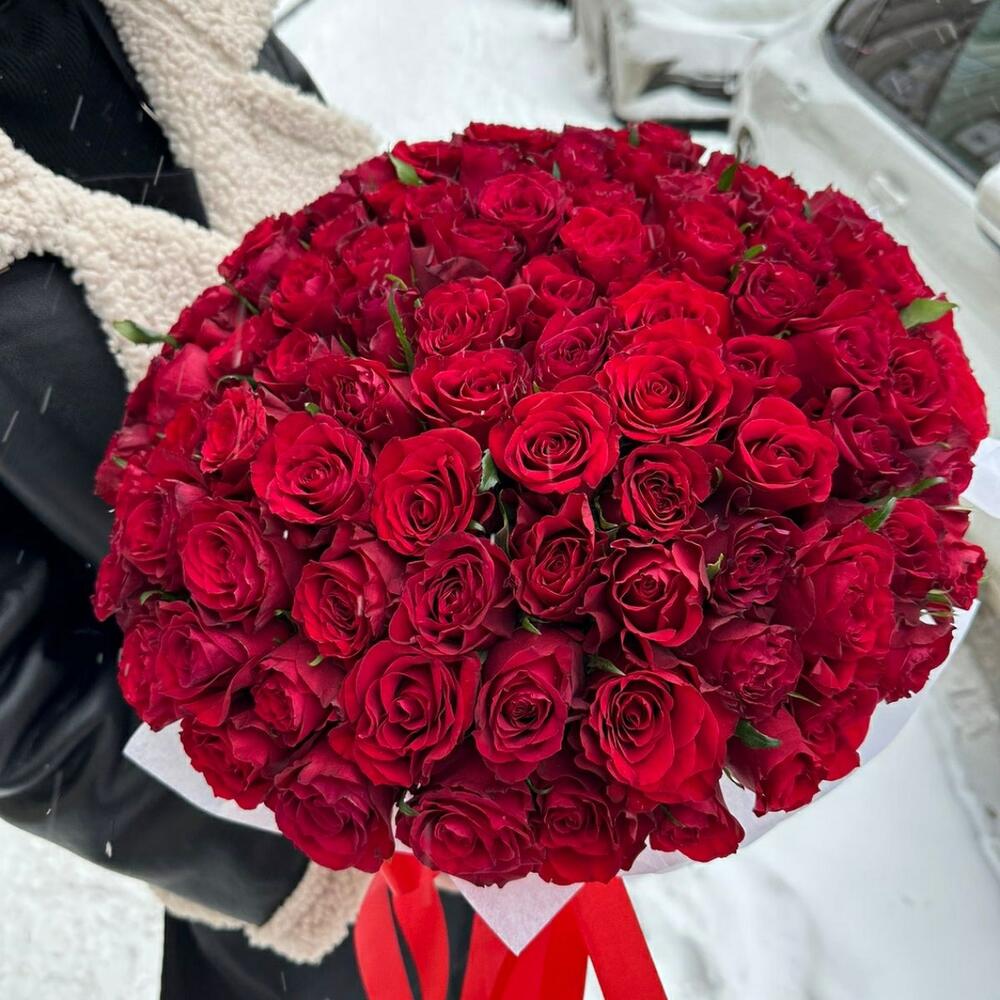 Роза красная – 101 шт.Коробка шляпная – 1 шт.аквабокс с водой – 1 шт.Лента атласная – 1 шт.