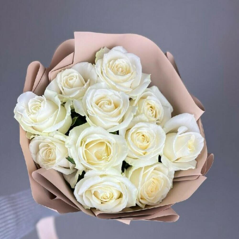 Нежный букет из 11 белых роз в стильном оформлении понравится каждой девушке.