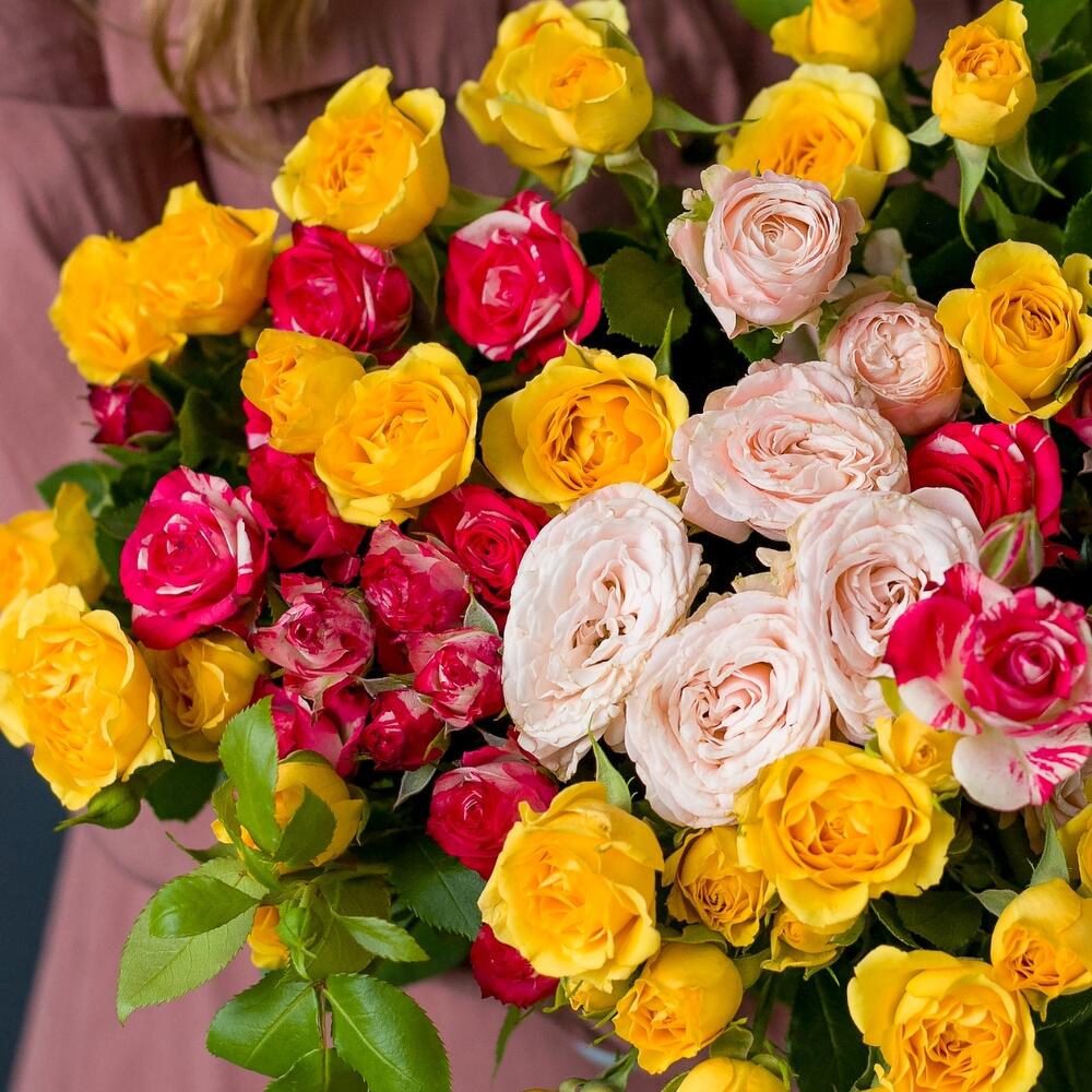 роза кустовая микс – 11 шт.Лента атласная – 1 шт.