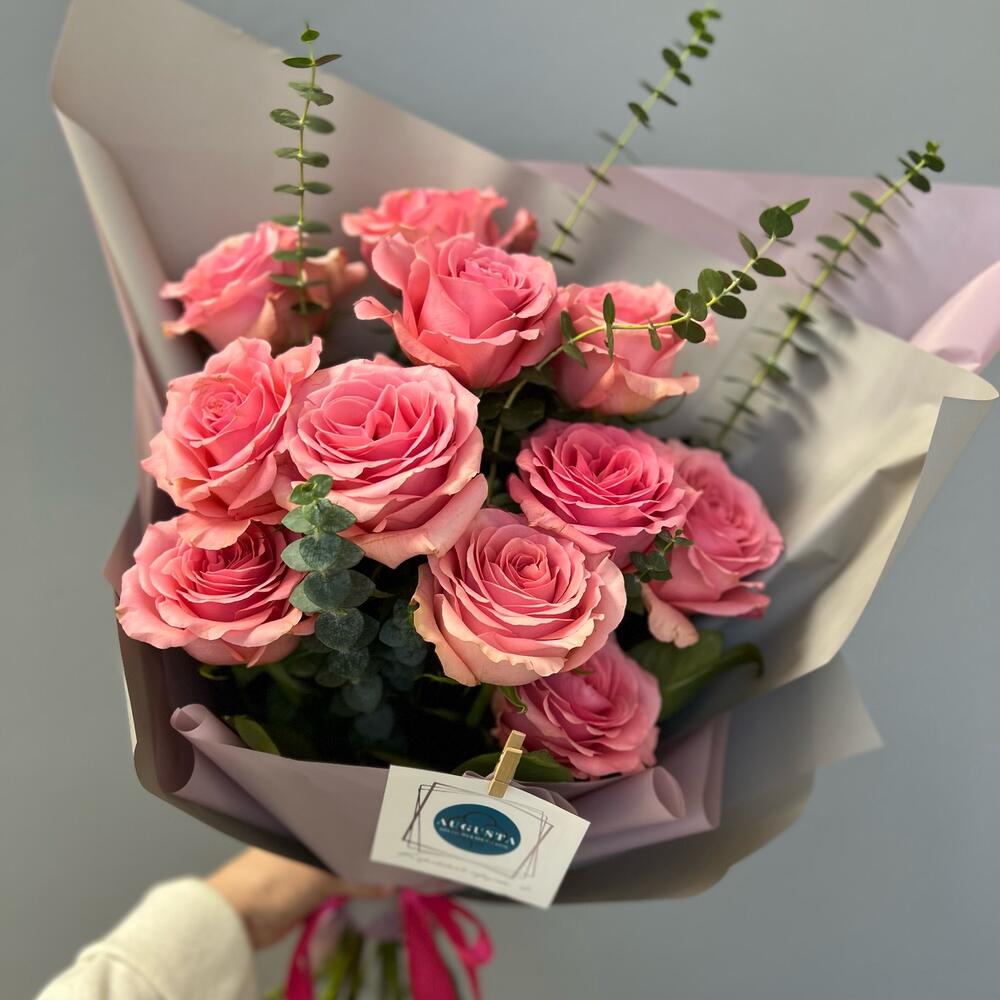 11 нежно-розовых роз с эвкалиптом