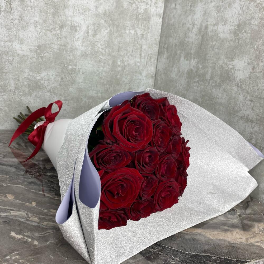 15 красных роз в блестящей упаковке