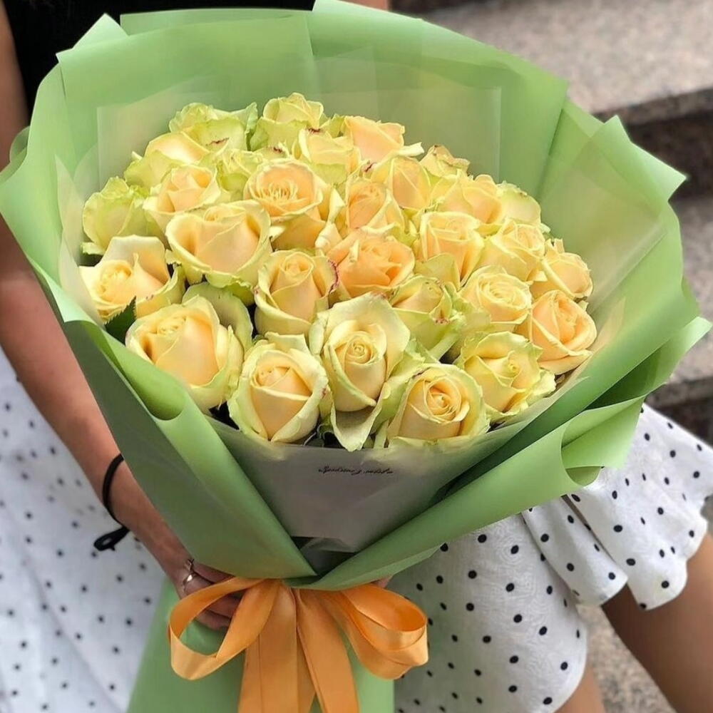 Нежный букет из кремовых роз в стильном оформлении будет уместен на семейное торжество. Такому букету будут рады как женщины в возрасте, так и молодые девушки.