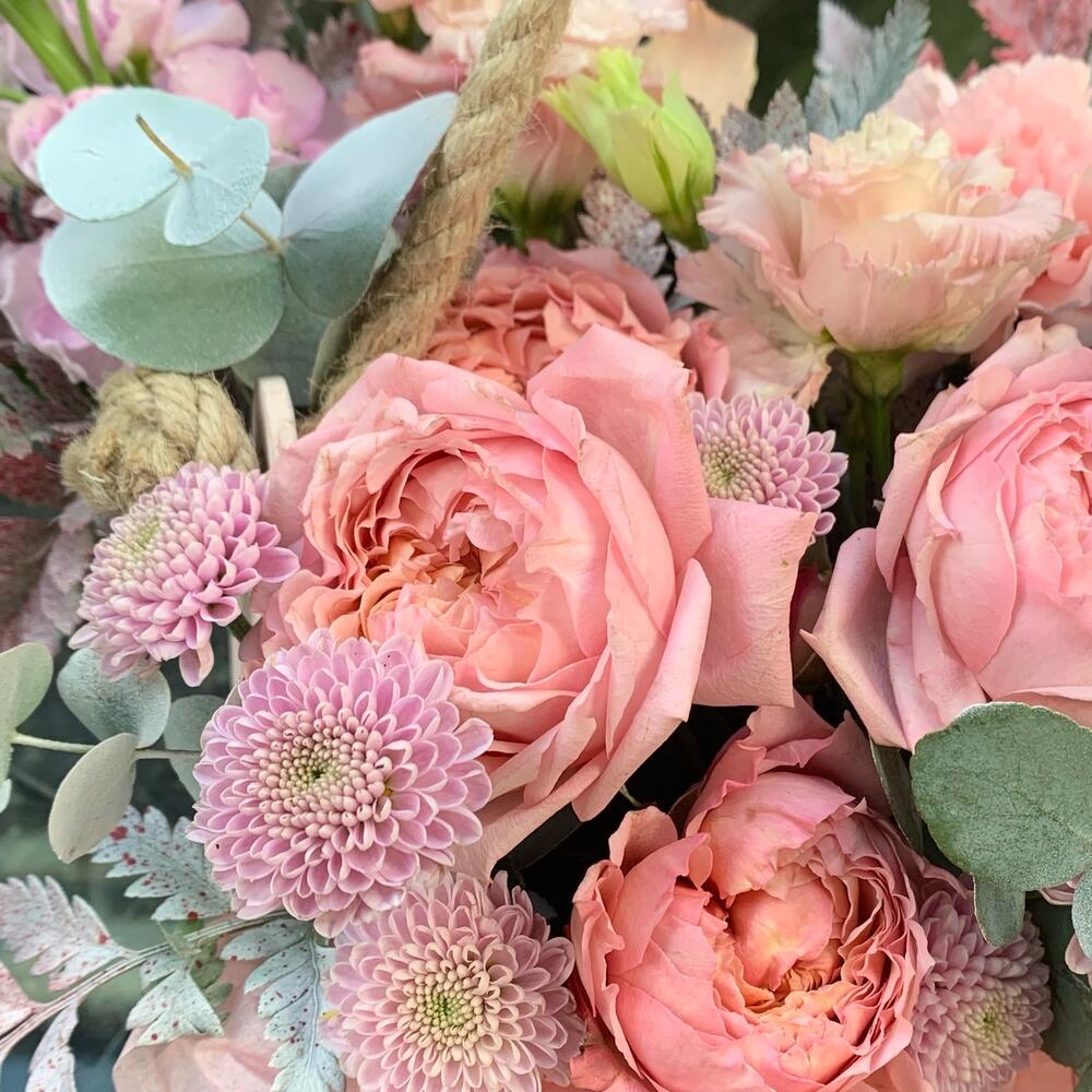 Лизиантус – 1 шт.Маттиола – 1 шт.Папоротник – 1 шт.Сантиния – 1 шт.Диантус розовый – 2 шт.джульетта роза пионовидная – 1 шт.