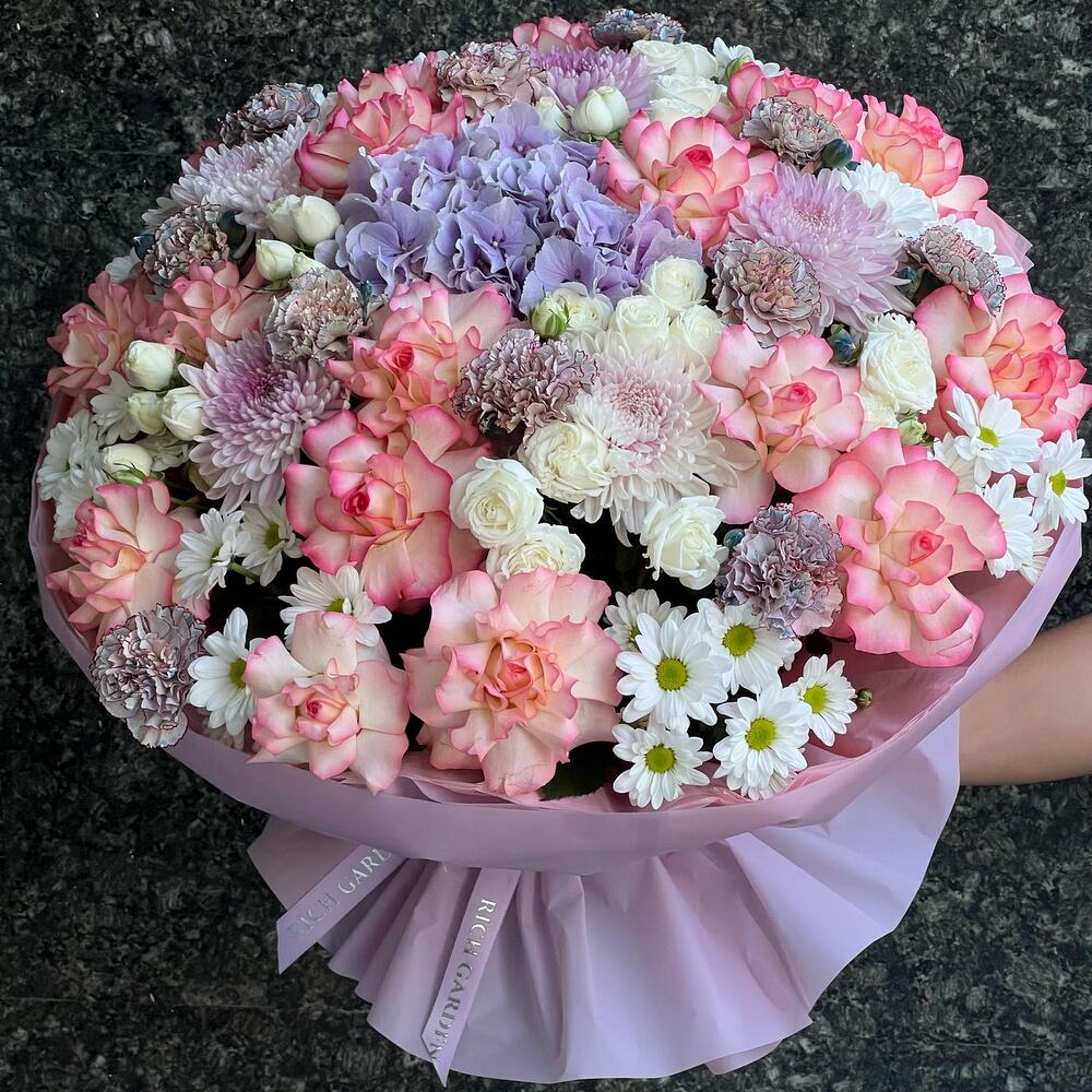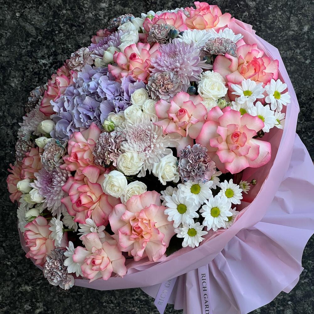 Гортензия – 1 шт. Роза – 17 шт. Спрей роза – 3 шт. Хризантема – 5 шт. Хризантема кустовая – 8 шт. Рускус – 5 шт. Диантус – 12 шт. бумага дизайнерская – 1 шт.