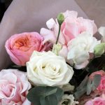Французская роза – 3 шт.Пионовидная роза – 2 шт.Эустома – 1 шт.Роза кустовая – 1 шт.Роза белая – 2 шт.Ковыль – 2 шт.Эвкалипт – 1 шт.Тишью – 2 шт.Матовая пленка – 2 шт.Атласная лента – 2 шт.